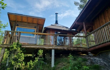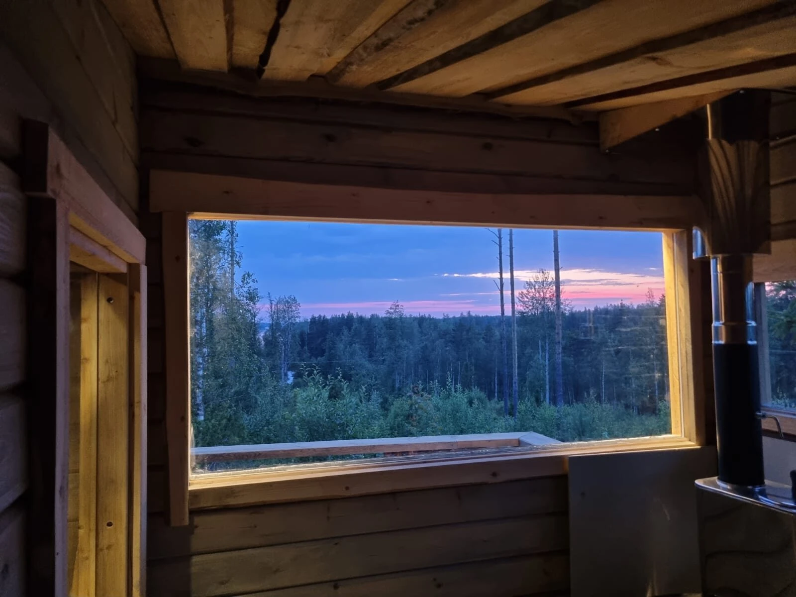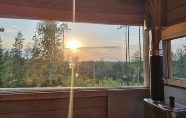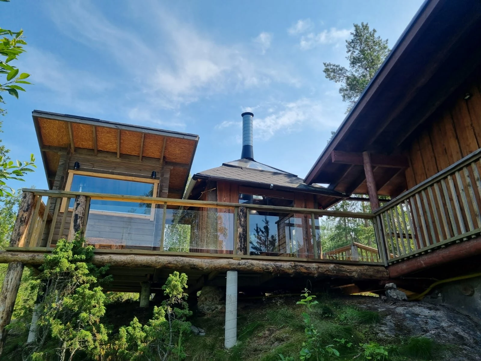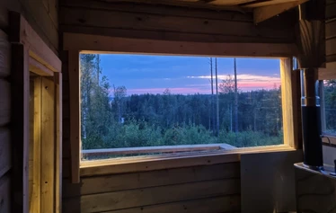 Mökki ja grillikota on itse rakennettu lähimetsän kelopuista, saunan kehikon hirret höylätty lähihöyläämössä.