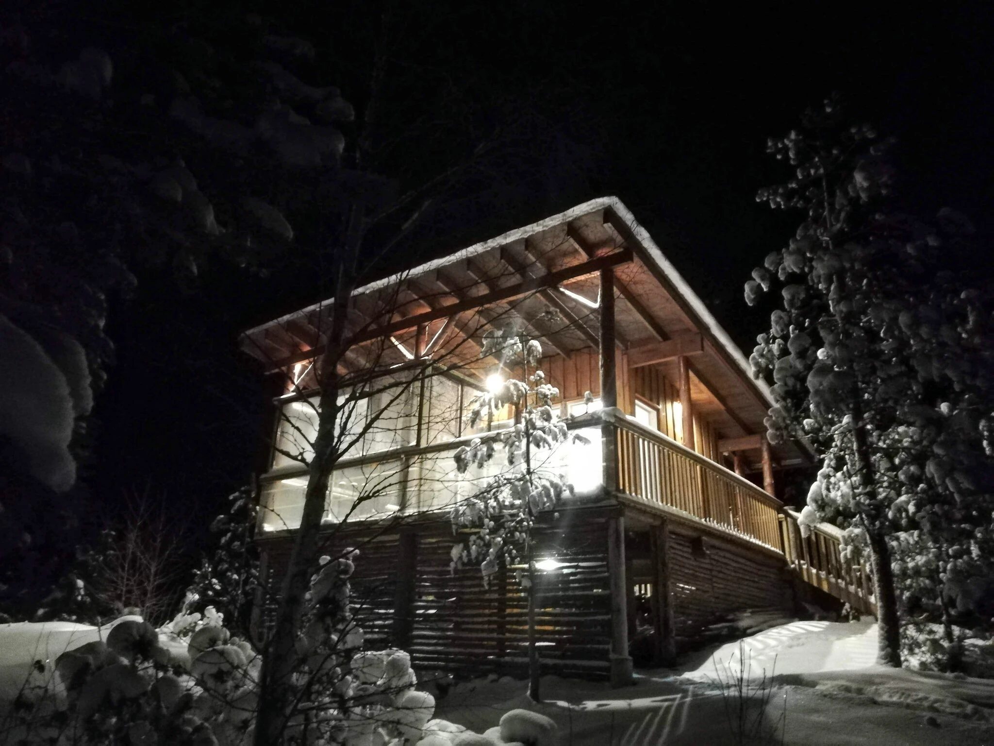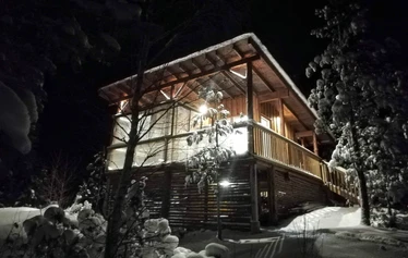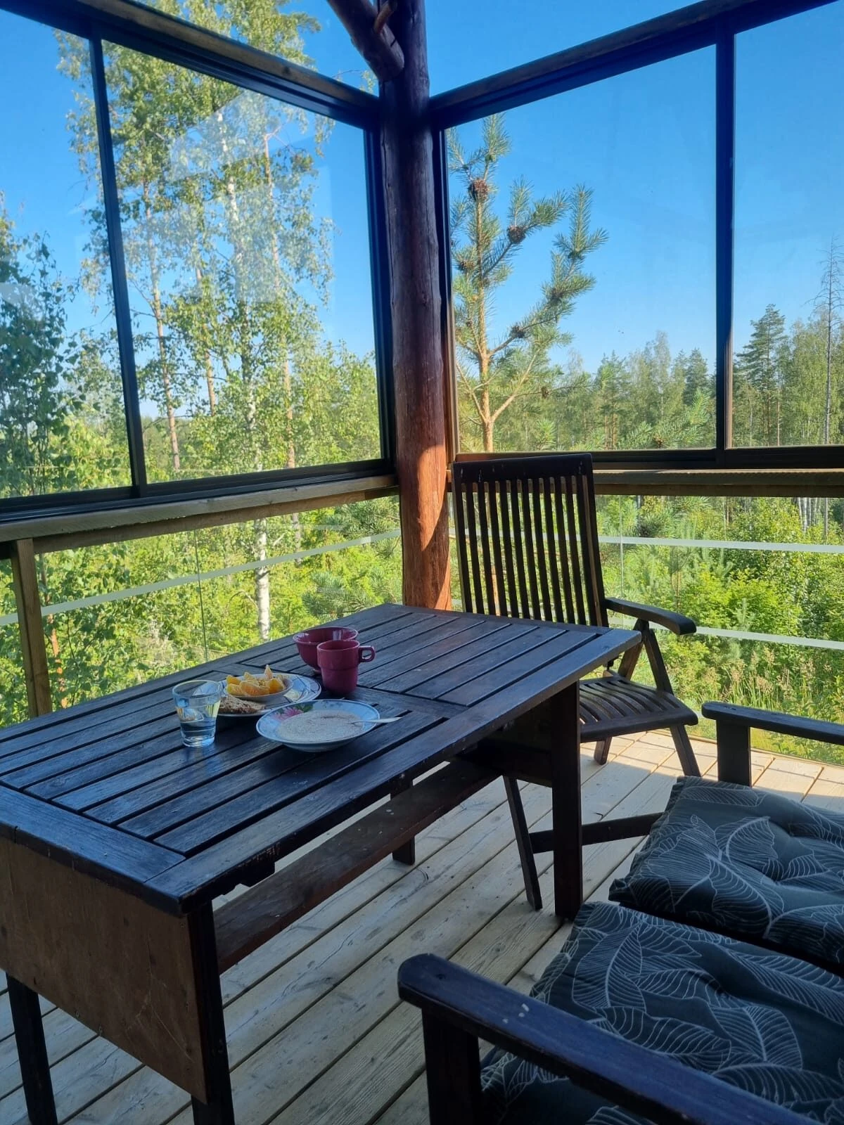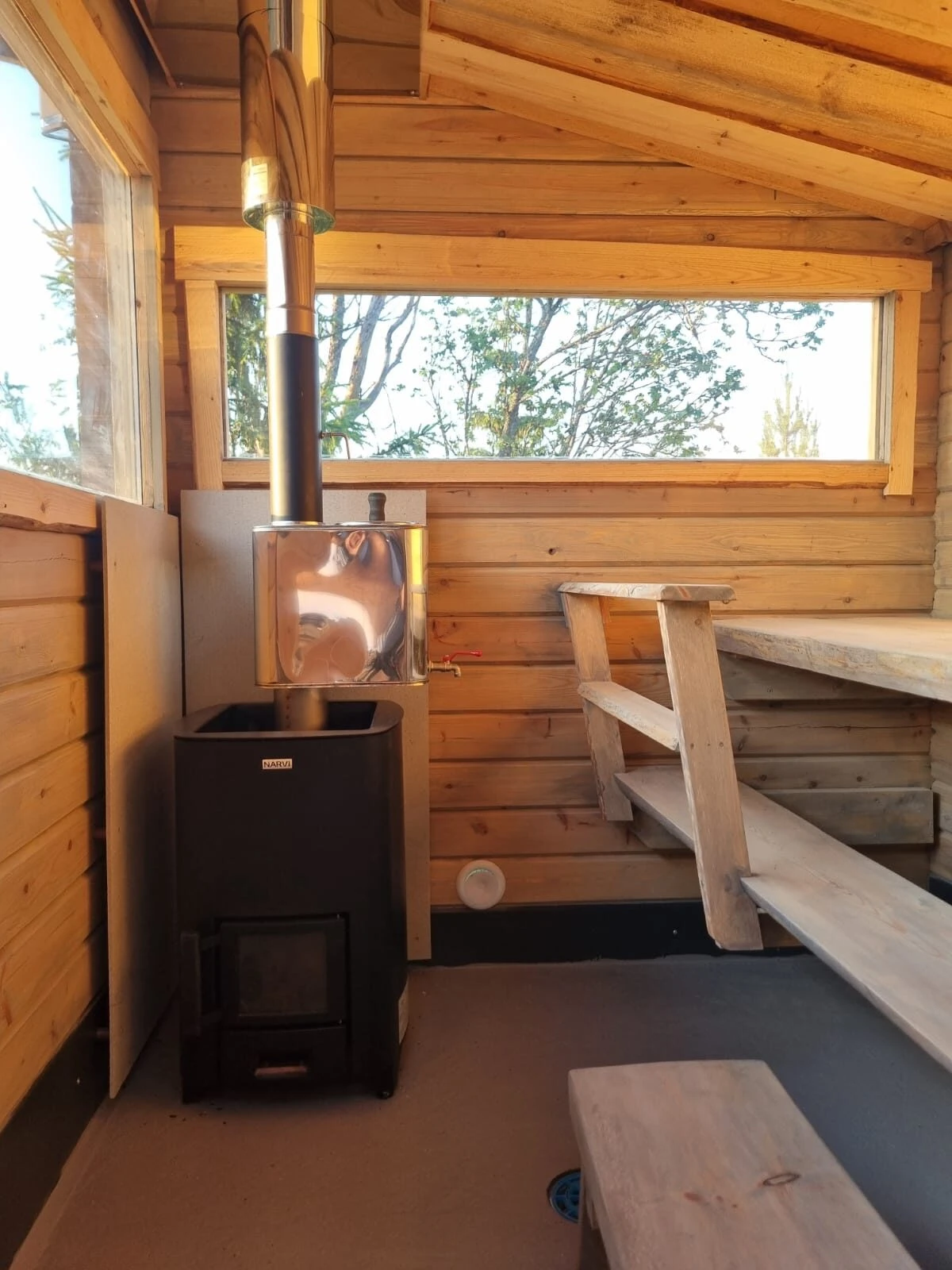 Mökki ja grillikota on itse rakennettu lähimetsän kelopuista, saunan kehikon hirret höylätty lähihöyläämössä.
